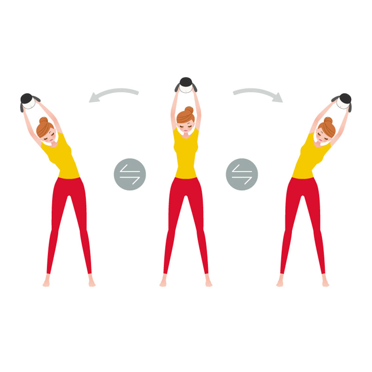 頭上にあげたボルレッチを左右にふります。腕と頭部を固定して連続で行います。