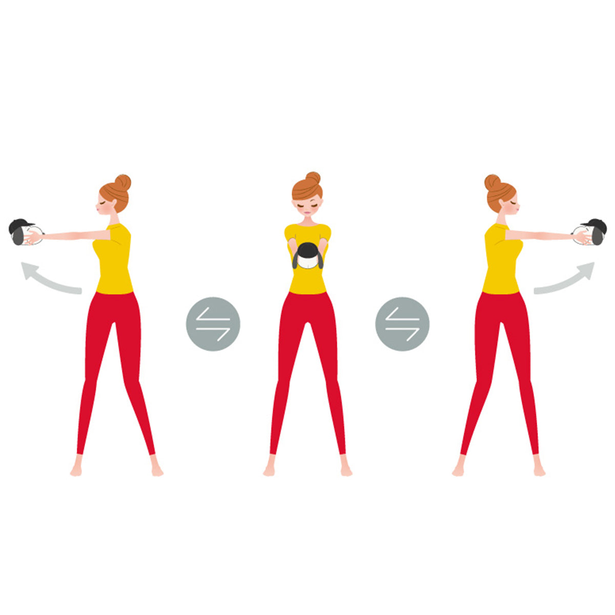 脚を肩幅に開き、肘を伸ばしたまま顔の前でボルレッチを持ち、左右に捻り元の位置に戻すのを交互に行います。