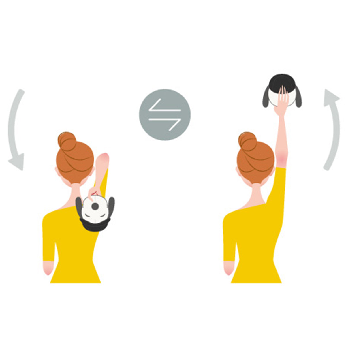 ボルレッチを持ち、頭の後ろにくるように腕を「く」の字に曲げ、腕をゆっくり上にむけてまっすぐ伸ばします。