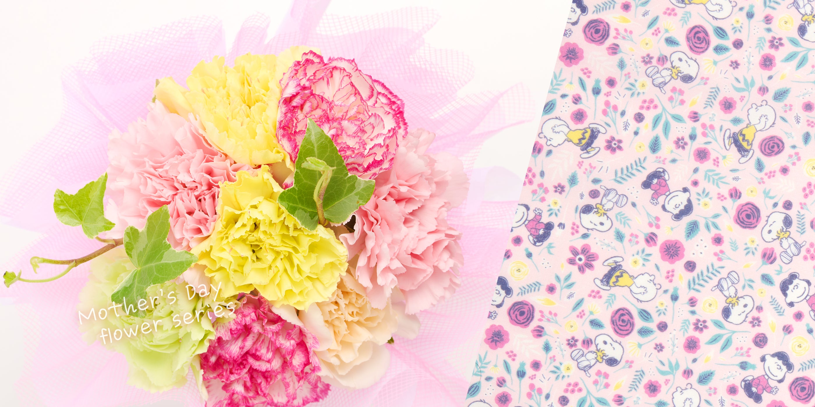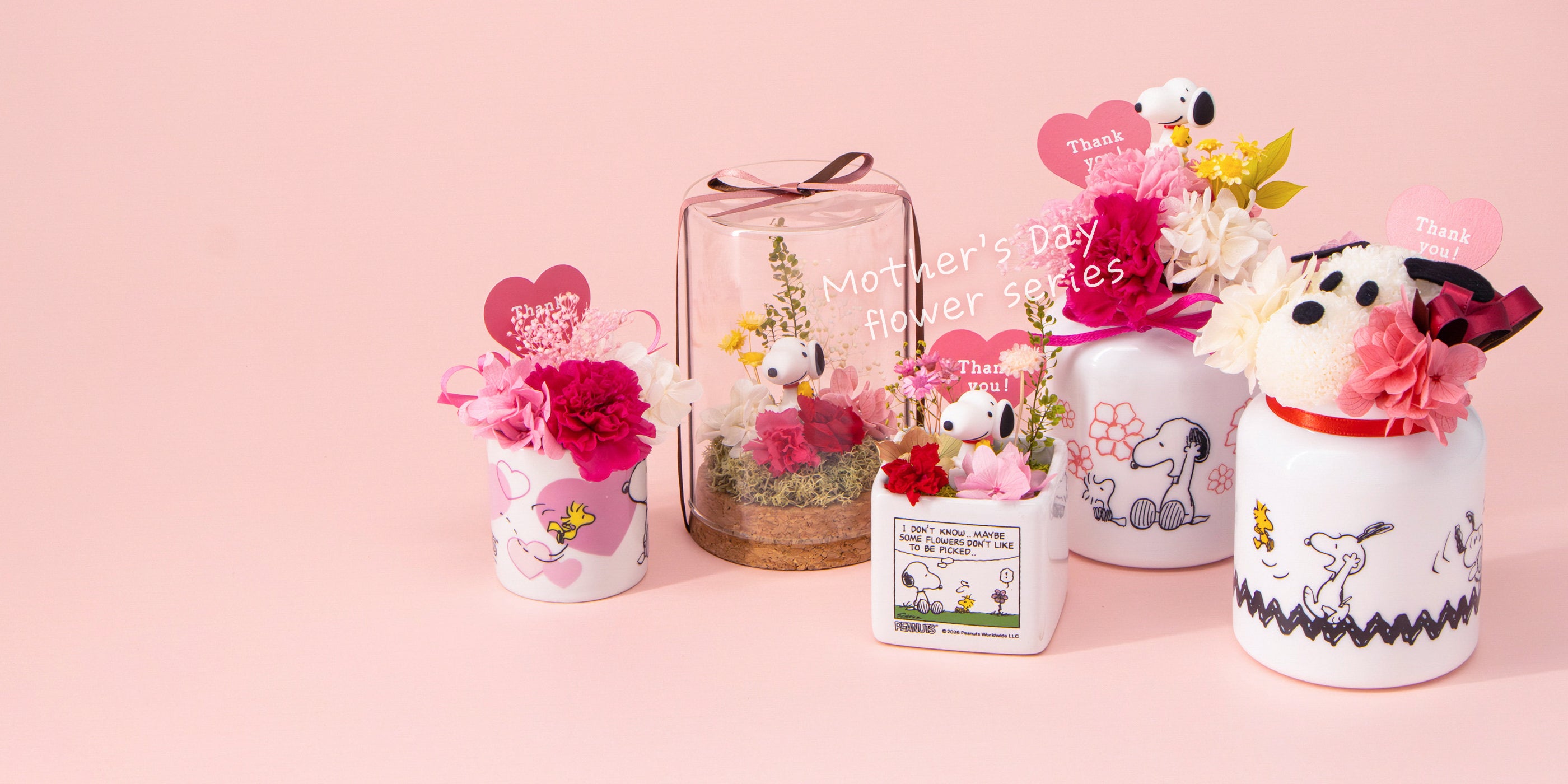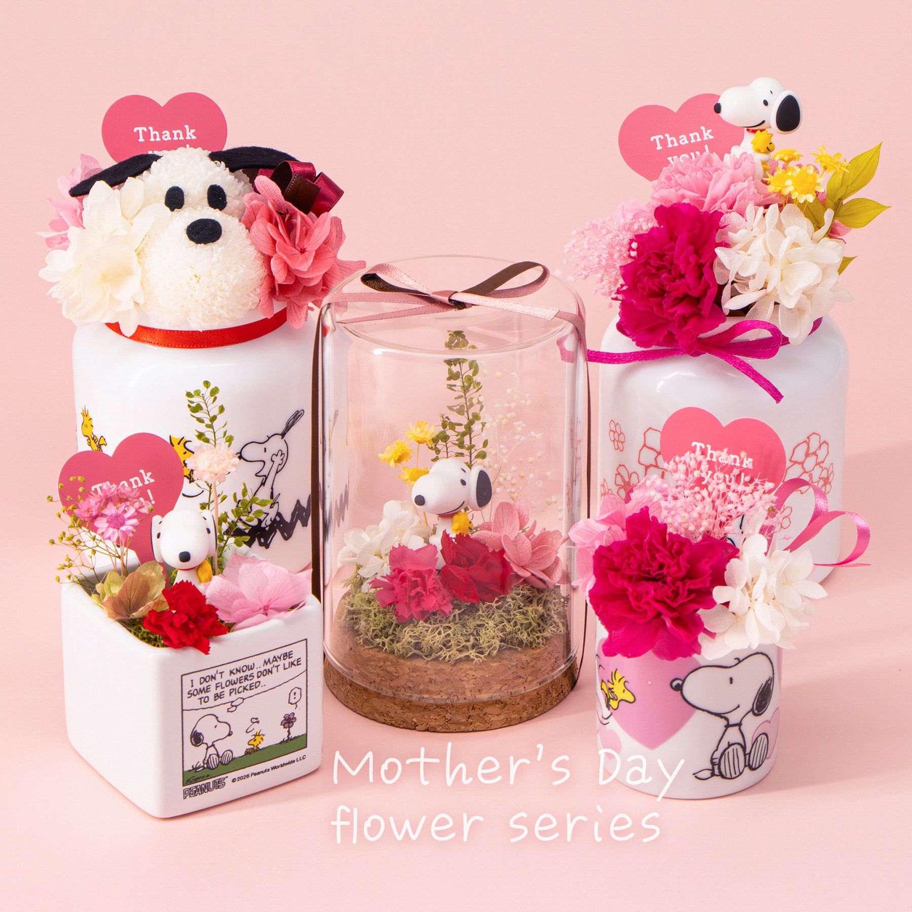 プリザーブドフラワーで作られたスヌーピーのお顔や、スヌーピーとウッドストックがハグしているマスコットが可愛いアレンジメントです。